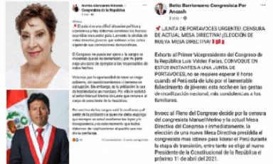 Huaraz en Línea. - Los congresistas ancashinos Norma Alencastre Miranda y Betto Barrionuevo Romero que votaron a favor de la vacancia del expresidente Martín Vizcarra condenaron la muerte de dos jóvenes durante las protestas y pidieron la renuncia de Manuel Merino a través del Facebook; sin embargo, se vieron obligados a retirar sus publicaciones por la avalancha de críticas que empezaron a recibir.