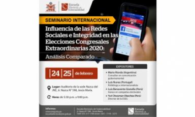 El seminario, denominado “Influencia de las redes sociales e integridad en las Elecciones Congresales Extraordinarias 2020: análisis comparado”, se llevará a cabo en el auditorio del JNE en Jesús María (Jirón Nazca 598), entre las 17:30 y 21:00 horas.