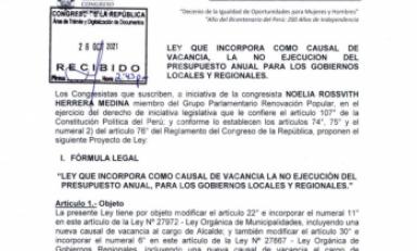 Huaraz en Línea.- La bancada de Renovación Popular presentó un proyecto de ley que incorpora la no ejecución del presupuesto anual como causal de vacancia para gobernadores regionales y alcaldes.