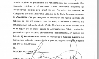 La resolución favorable a Ríos Salcedo está rubricada por los magistrados Josué Pariona Pastrana y Víctor Malca Guaylupo. En tanto el juez supremo Víctor Prado Saldarriaga, presidente de la sala, se pronunció por la improcedencia de la rehabilitación, en tanto no cumpla con pagar el monto que corresponde a los intereses devengados.
