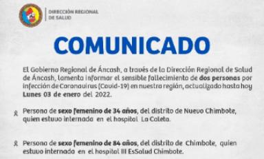 Huaraz en Línea. - La Dirección Regional de Salud de Áncash (DIRESA) informó que en las últimas 24 horas han perdido la vida dos mujeres a causa de la Covid-19 en Chimbote y Nuevo Chimbote.