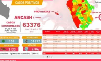 Según la DIRESA, en Áncash se han infectado 161 distritos, se han reportado 63,376 contagios, de los cuales 51,672 se recuperaron, 3,123 fallecieron y la letalidad es de 4.9%. (Redacción Central)