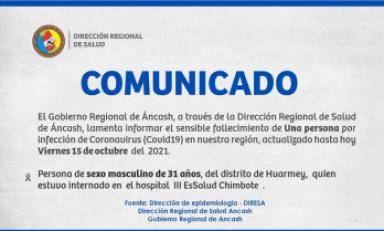 Huaraz en Línea. - La Dirección Regional de Salud de Áncash (DIRESA) ha informado el fallecimiento de un poblador huarmeyano de 31 años a causa de la Covid-19.