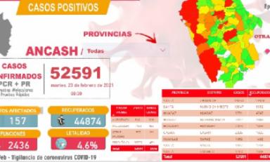La Dirección Regional de Salud de Áncash (DIRESA) informó que la pandemia ha causa hasta hoy la muerte de 2 mil 436 personas en esta región, donde se han contagiado 52 mil 591, de los cuales 44 mil 874 vencieron al temible virus y la letalidad es de 4.6%.