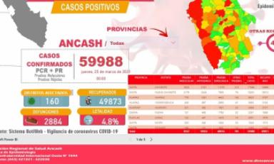 Las cifras oficiales de la DIRESA desde que inició la pandemia hasta hoy son: 59 mil 988 contagiados en Áncash, recuperados 49 mil 873, fallecidos 2 mil 884, los distritos infectados son 160 y la letalidad en esta región es de 4.8.