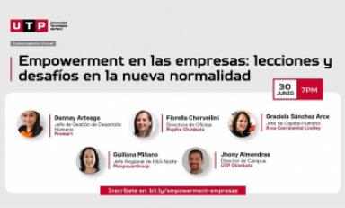 Para tratar este tema, el Campus Chimbote de la Universidad Tecnológica del Perú (UTP) realizará el conversatorio virtual gratuito “Empowerment en las empresas: lecciones y desafíos en la nueva normalidad”. El evento se llevará a cabo, vía Zoom, el miércoles 30 de junio a las 7:00 p. m.
