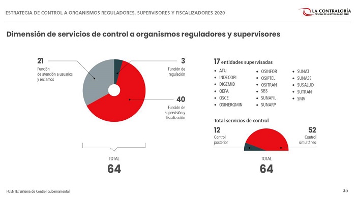 En total, hasta diciembre la Contraloría realizará 64 servicios de control a 17 organismos, que además de los mencionados, incluye a la Autoridad de Transporte Urbano (ATU), la Superintendencia Nacional de Fiscalización Laboral (SUNAFIL), la Superintendencia Nacional de Aduanas y de Administración Tributaria (SUNAT), la Superintendencia Nacional de los Registros Públicos (SUNARP), la Superintendencia del Mercado de Valores (SMV), el Organismo Supervisor de las Contrataciones del Estado (OSCE), el Organismo de Evaluación y Fiscalización Ambiental (OEFA) y el Organismo de Supervisión de los Recursos Forestales y de Fauna Silvestre (OSINFOR).