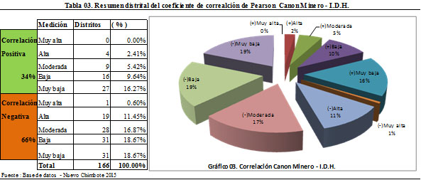 La correlación distrital entre canon minero e I.D.H es baja (débil) alcanzando apenas 0.3284 , de los 166 distritos el 66% tiene un indicador de correlación negativa entre canon minero e I.D.H. Y si aislamos los de muy baja correlación, solamente el 18% de distritos presentan correlación positiva; por lo tanto los los presupuestos públicos provenientes del canon minero no han sido el factor que haya contribuido en la mejora y evolución de sus I.D.H.