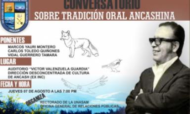 Huaraz en Línea.- El rectorado de la Universidad Nacional "Santiago Antúnez de Mayolo" (Unasam) en coordinación con la Oficina General de Relaciones Públicas realizarán un Conversatorio sobre la Tradición Oral Ancashina con la participación del connotado escritor huarasino Marcos Yauri Montero.