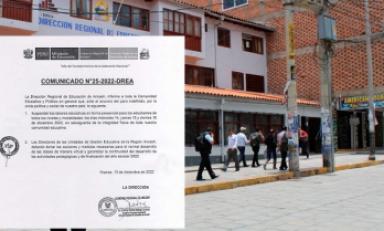 Huaraz en Línea. – El director regional de Educación en Áncash, Alfredo Medina Corcuera, a través de un comunicado dispuso la suspensión de las clases presenciales el 14, 15 y 16 de diciembre ante el anuncio de paro indefinido en esta región.