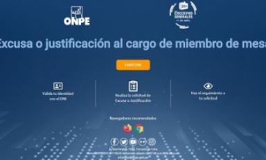 Huaraz en Línea.- La Oficina Nacional de Procesos Electorales (ONPE) informó que las excusas o justificaciones al cargo de miembro de mesa se puedan tramitar de manera presencial en cada una de las 94 oficinas descentralizadas o de manera virtual a través del Sistema de excusa o justificación al cargo de miembro de mesa en el siguiente enlace: https://www.excusaojustificacion.eleccionesgenerales2021.pe/
