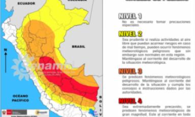 Huaraz en Línea.- El Servicio Nacional de Meteorología e Hidrología (Senamhi) emitió el primer aviso de nivel 4 del año, es decir, advierte sobre fenómenos peligrosos, por las lluvias de moderada a fuerte intensidad, acompañadas de descargas eléctricas y ráfagas de viento, que se registrarán desde hoy a escala nacional.