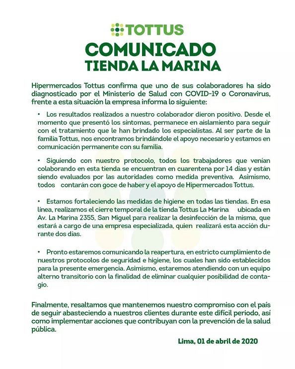 La empresa informó que cerró de manera preventiva el referido establecimiento en Lima, el cual será sometido a la desinfección integral de todos sus ambientes, en los próximos dos días, por parte de una firma especializada. Esto se hizo público a través de un comunicado.
