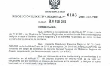 De igual manera, a través de la Resolución Ejecutiva Regional N° 0107 – 2015 – GRA/PRE y con fecha 10 de febrero de 2015, el Presidente Regional de Ancash designó al abogado Fredy Enrique Domínguez Giraldo en el cargo de confianza de Secretario General del Gobierno Regional de Ancash, con los derechos y obligaciones inherentes al cargo.