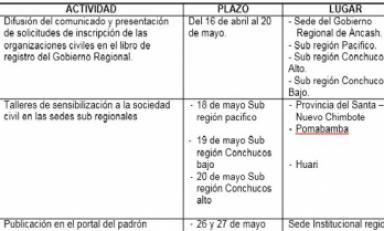 El cronograma de actividades para la conformación e instalación del Consejo de Coordinación Regional del Gobierno Regional de Áncash se iniciará desde el 16 de abril al 28 de mayo del presente año.
