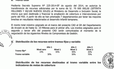 Lo más preocupante es que dicho monto no se ha empleado debido a la inestabilidad y al aparente desgobierno durante la gestión de Puro Ancash mientras que parte de las cláusulas establecidas para su cumplimiento mediante una serie de indicadores referido a la mejora de la calidad de vida de la población infantil ubicados en los distritos y provincia más pobres de Ancash, han perdido la oportunidad que esperaban.