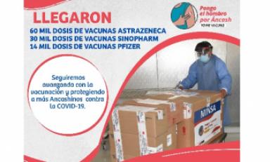 El Ministerio de Salud (Minsa) ha enviado a la región Áncash 60 mil dosis de vacunas Astrazeneca, 30 mil dosis de vacunas Sinopharm y 14 mil dosis de vacunas Pfizer.
